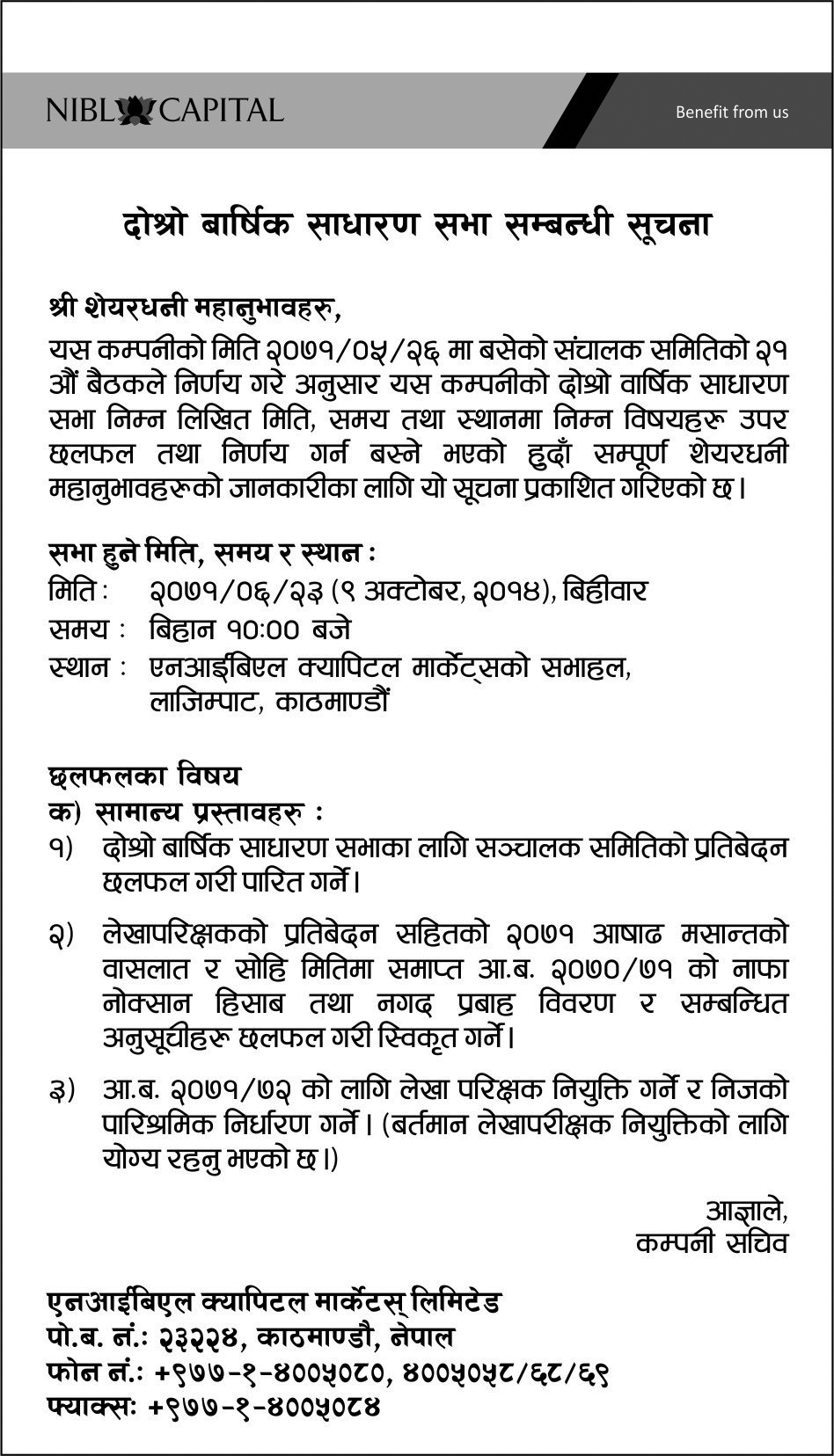 The 2nd AGM of NIBL Capital Markets Ltd. will be held on 23 Aswin 2071 (9 October 2014) at 10:00 am in the premises of NIBL Capital Market Ltd., Lazimpat.