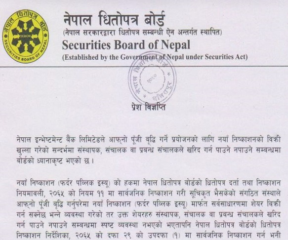 SEBON Press Release for NIBL – FPO