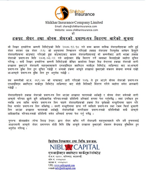 Shikhar Insurance Company Ltd. has begun distributing share certificates for its 2:1 right shares, 20% bonus shares and for right share auction via NIBL Capital Markets Ltd. in Lazimpat, Kathmandu today ( July 6 2014, 22 Asar 2071).