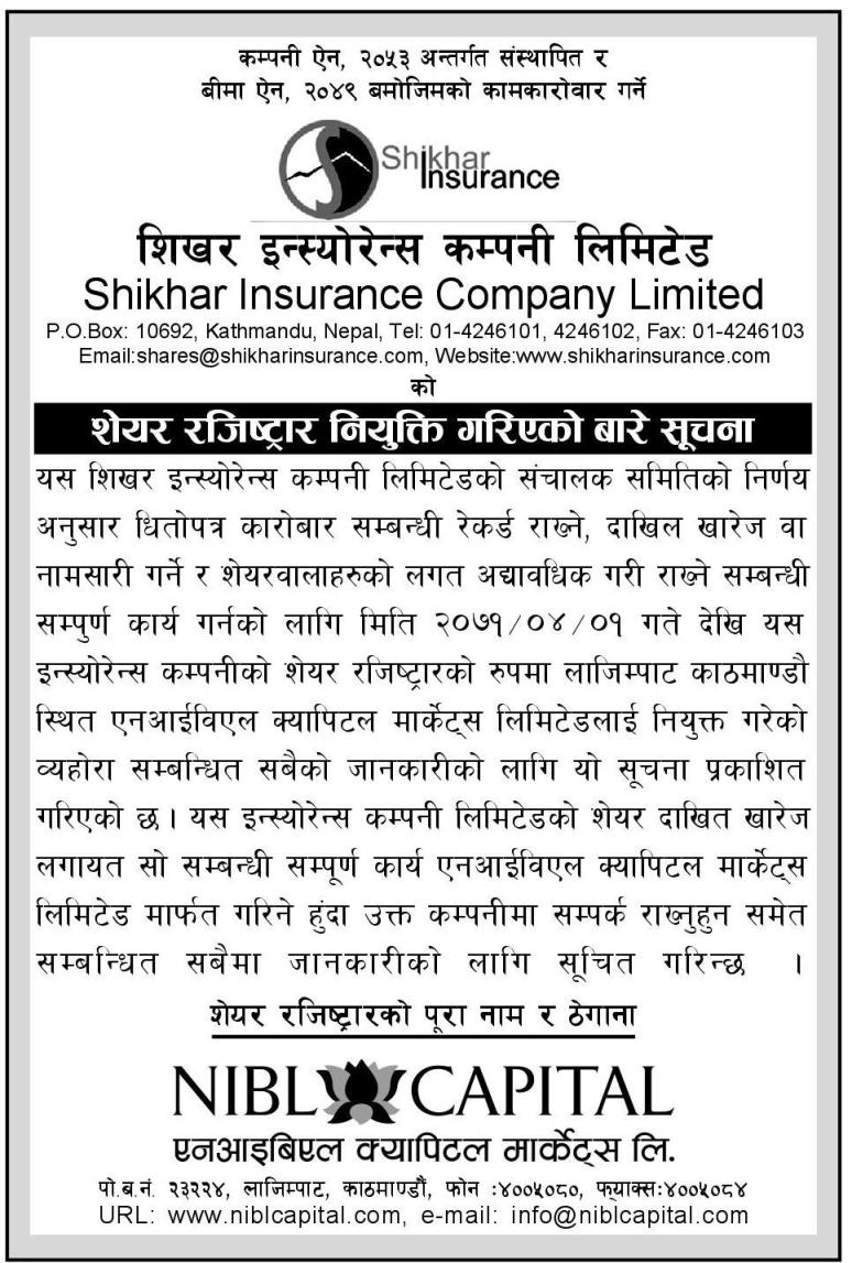 NIBL Capital Markets Ltd. has been appointed as the RTS of Shikhar Insurance Company Lts. (SICL) as of 2071/04/01 (17 July 2014) by the Board of Directors of SICL.